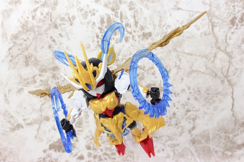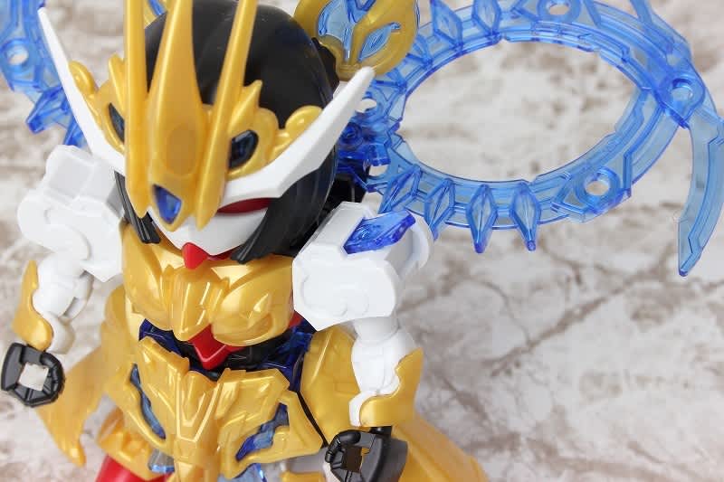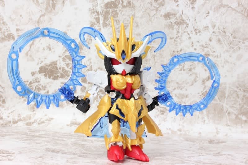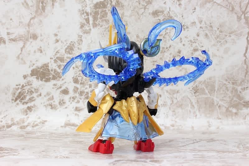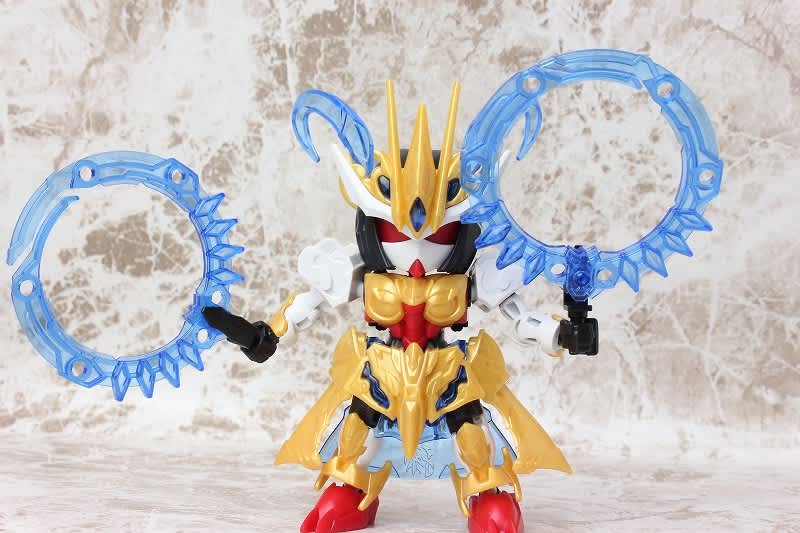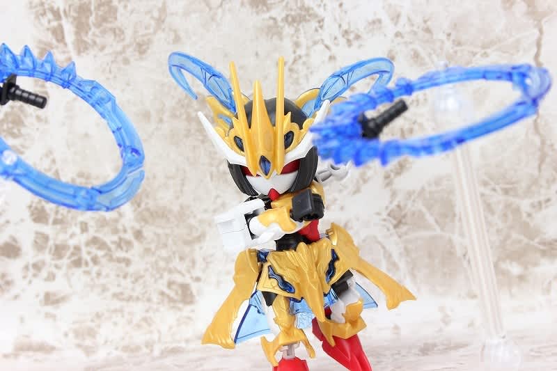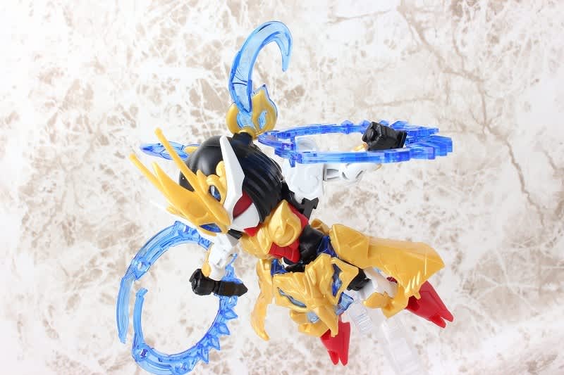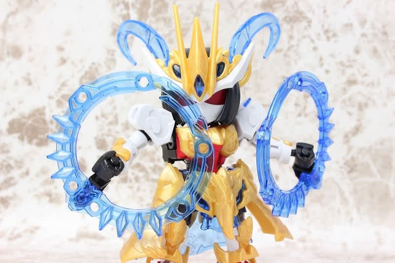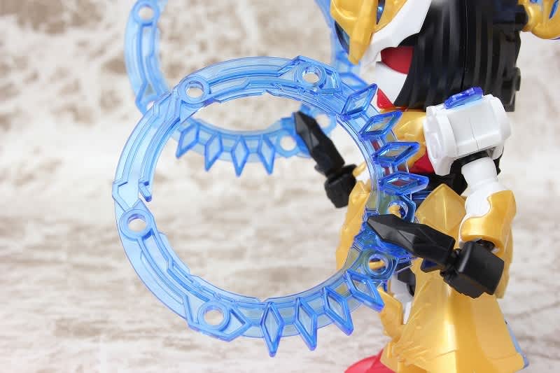SDガンダムではなかなか珍しい武器のチャクラム。この虎吼戦輪は、背部ユニットからチャクラムになる時ピッタリ円状になるのが気持ち良いです。