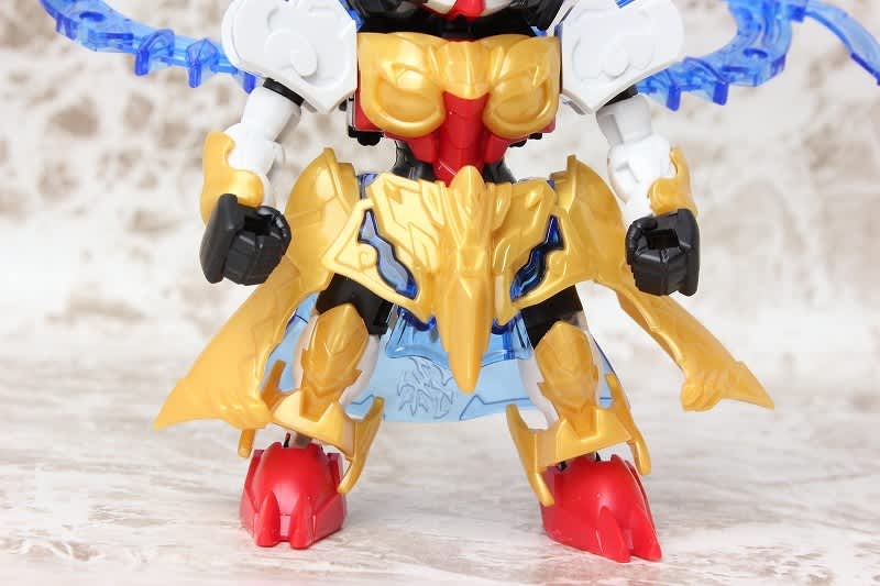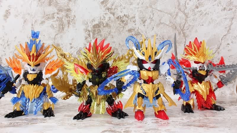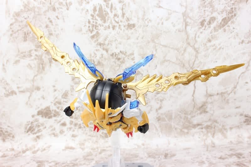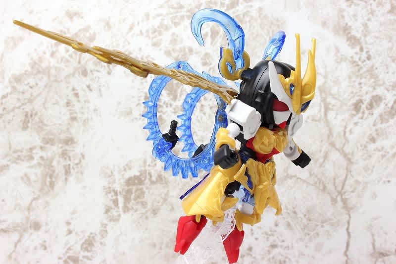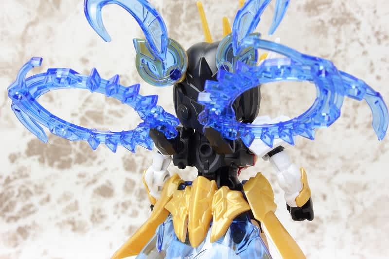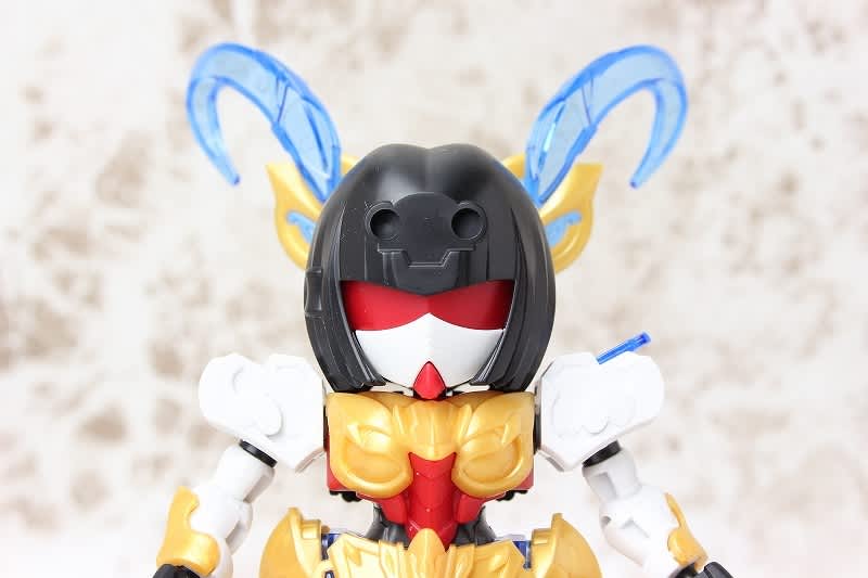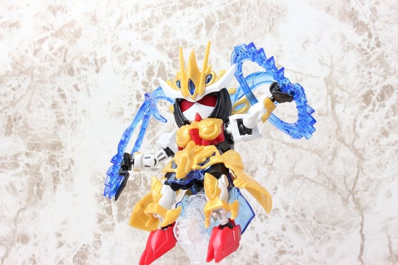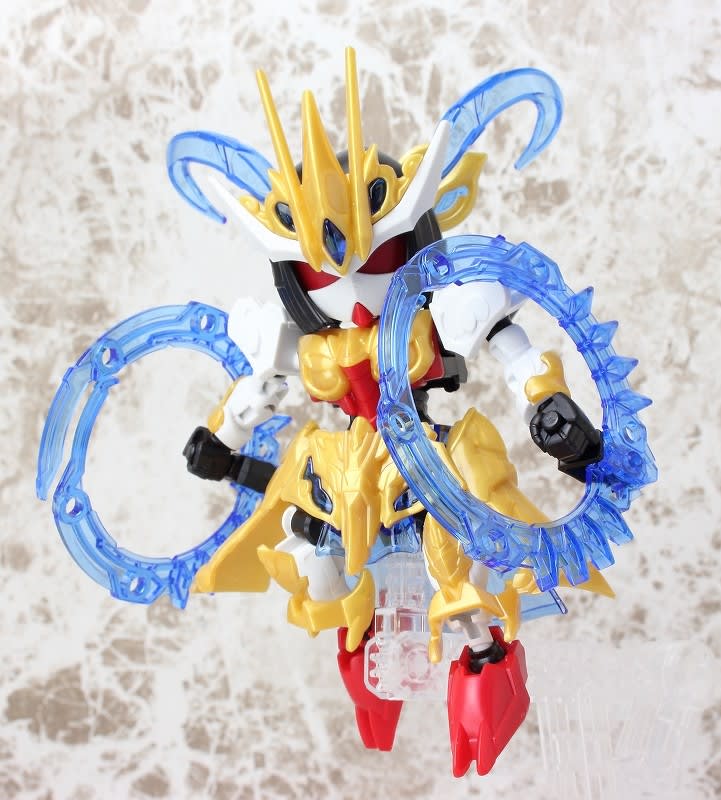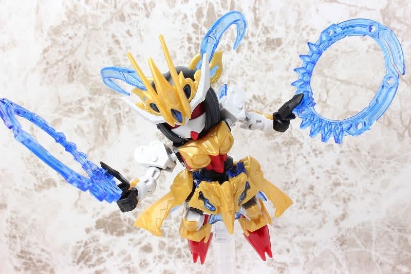 SDガンダムではなかなか珍しい武器のチャクラム。この虎吼戦輪は、背部ユニットからチャクラムになる時ピッタリ円状になるのが気持ち良いです。